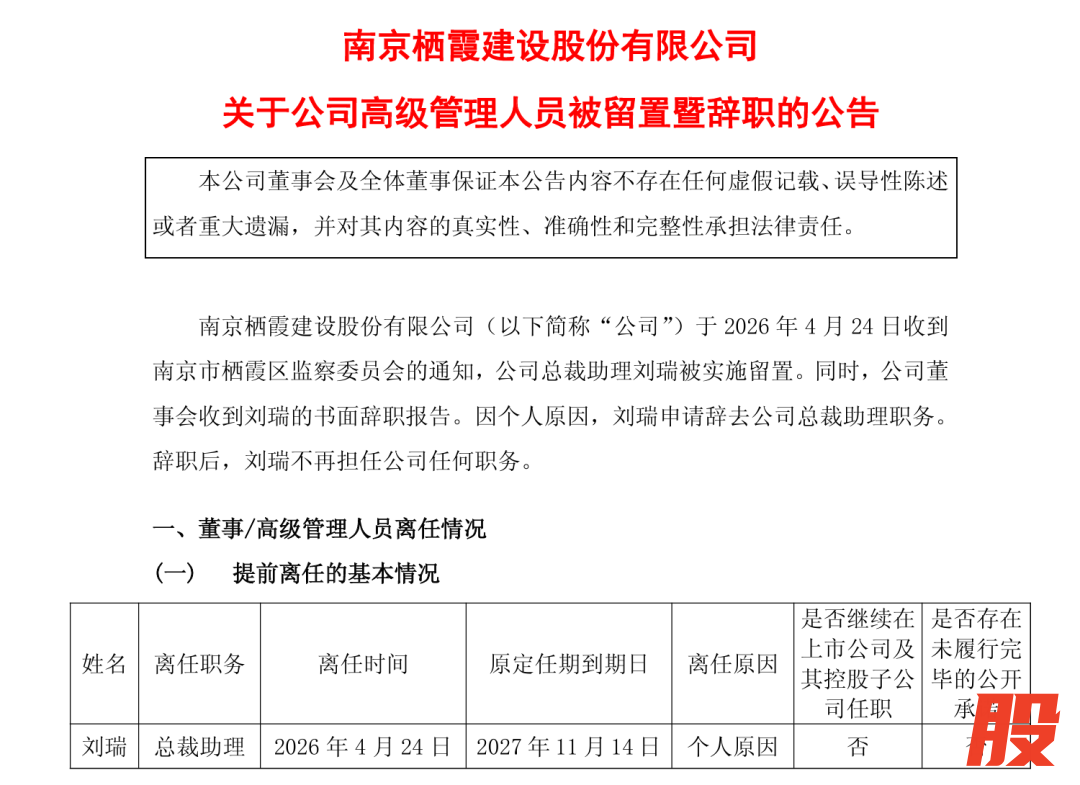 4月26日晚间,栖霞建设(600533)发布公告称,公司于4月24日收到南京市栖霞区监察委员会通知,公司总裁助理刘瑞被实施留置。同日,公司董事会收到刘瑞的书面辞职报告,其因个人原因申请辞去总裁助理职务。辞职生效后,刘瑞不再担任公司任何职务。